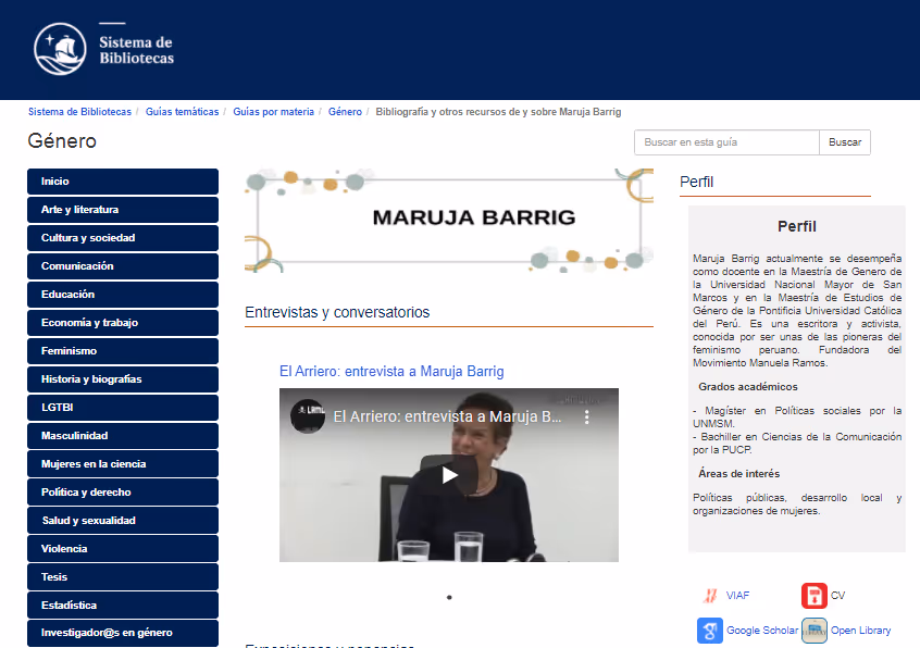 La sección reúne bibliografía tanto impresa como digital; hay artículos, entrevistas y ponencias en video de Barrig, quien se desempeña actualmente como docente en la Maestría de Género de la Universidad Nacional Mayor de San Marcos y en la Maestría de Estudios de Género de la Pontificia Universidad Católica del Perú.
